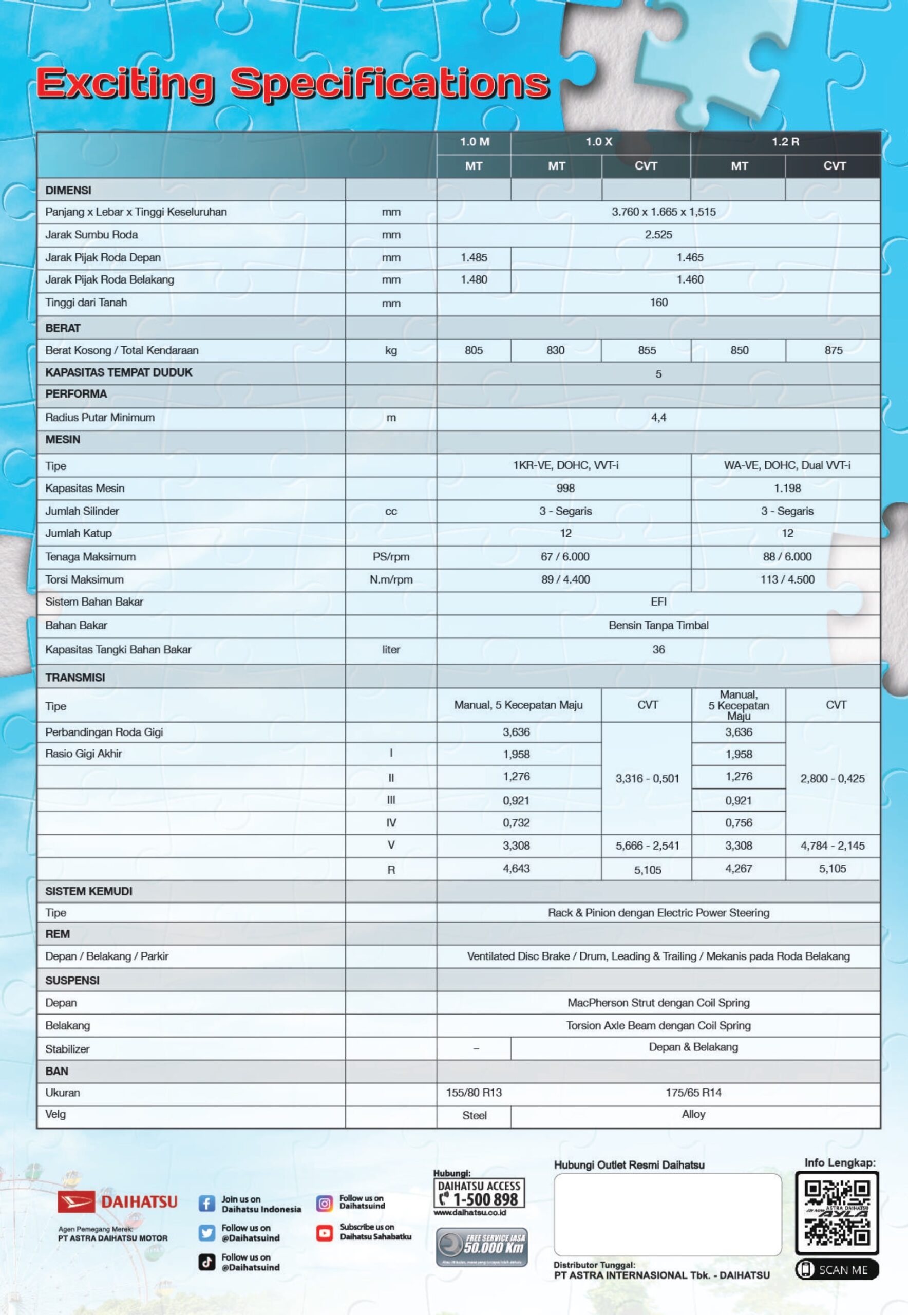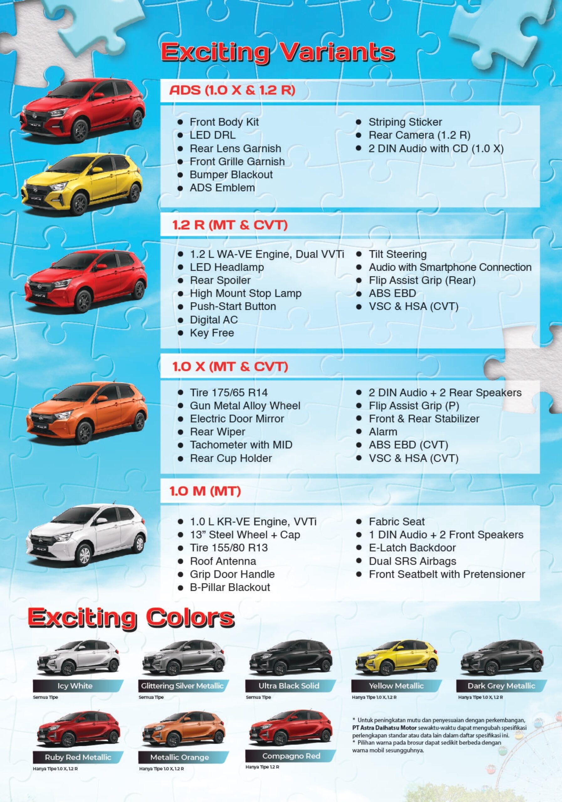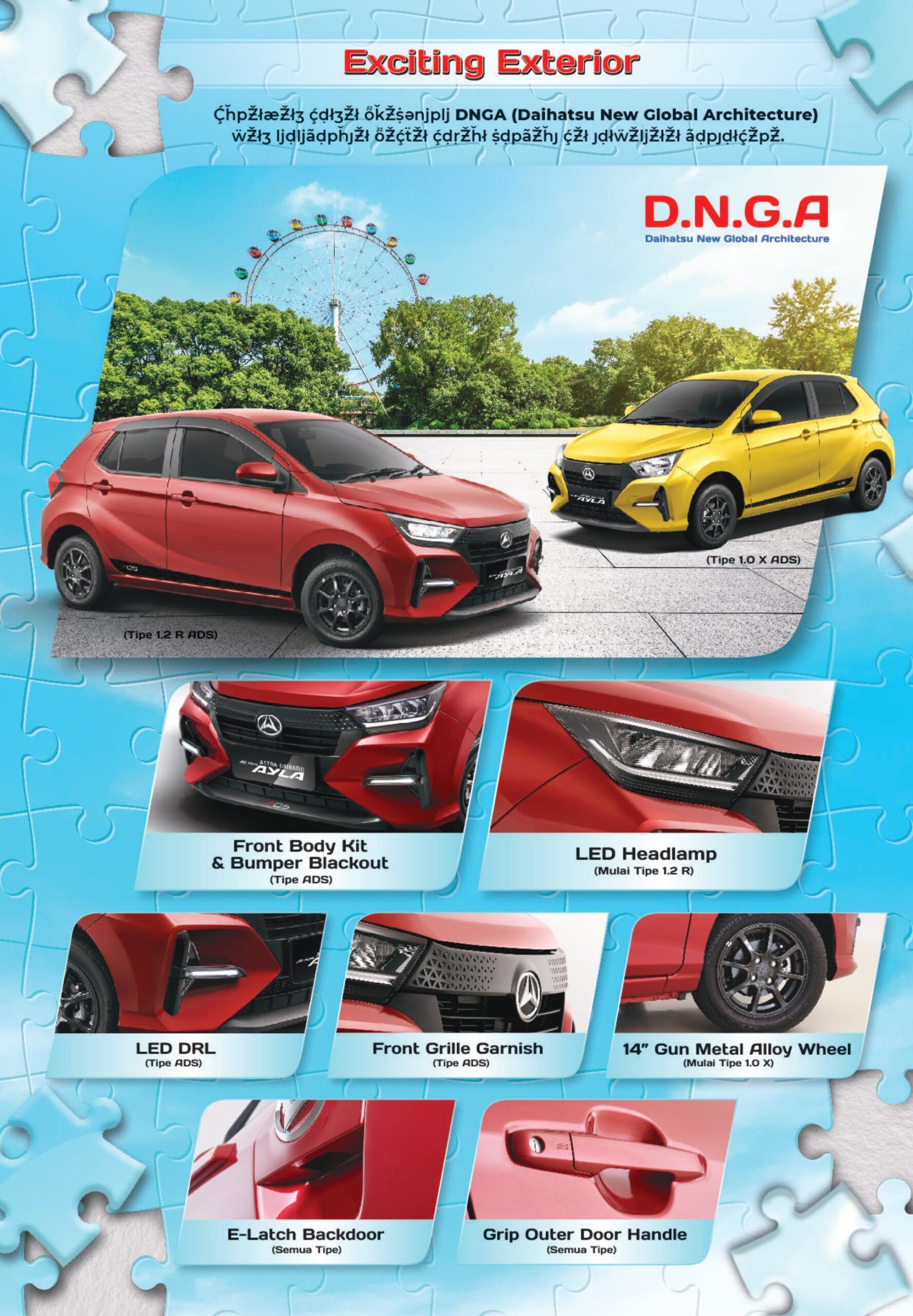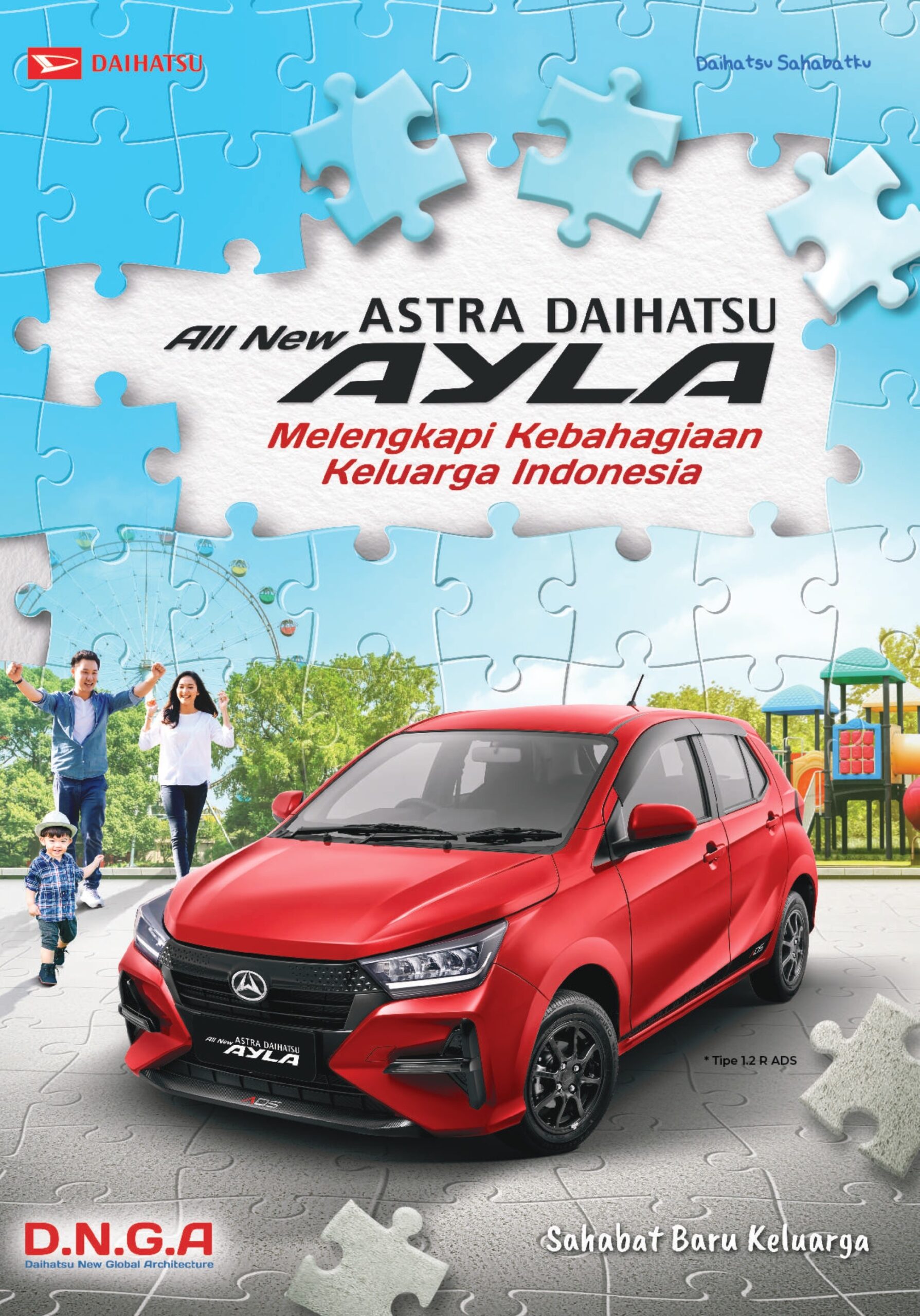 All New Astra Daihatsu Ayla senantiasa hadir untuk Melengkapi Kebahagiaan Keluarga Indonesia Menggunakan platfrom baru D.N.G.A dan desain yang stylish, membuat tampilan All New Astra Daihatsu Ayla lebih Fresh & Sporty. Dengan 2 pilihan mesin 1.0 L dan 1.2 L membuat performa perjalanan Keluarga semakin seru.