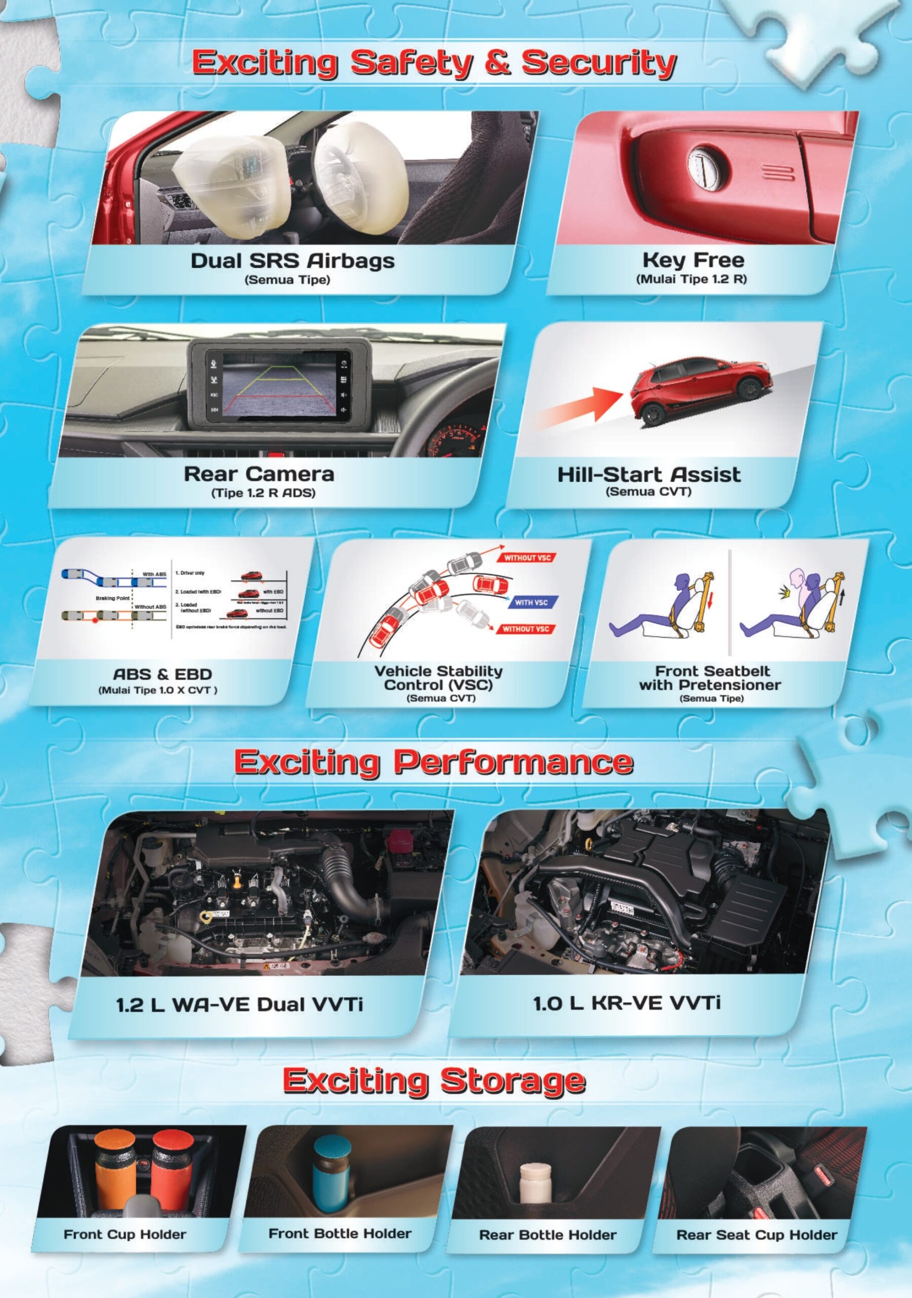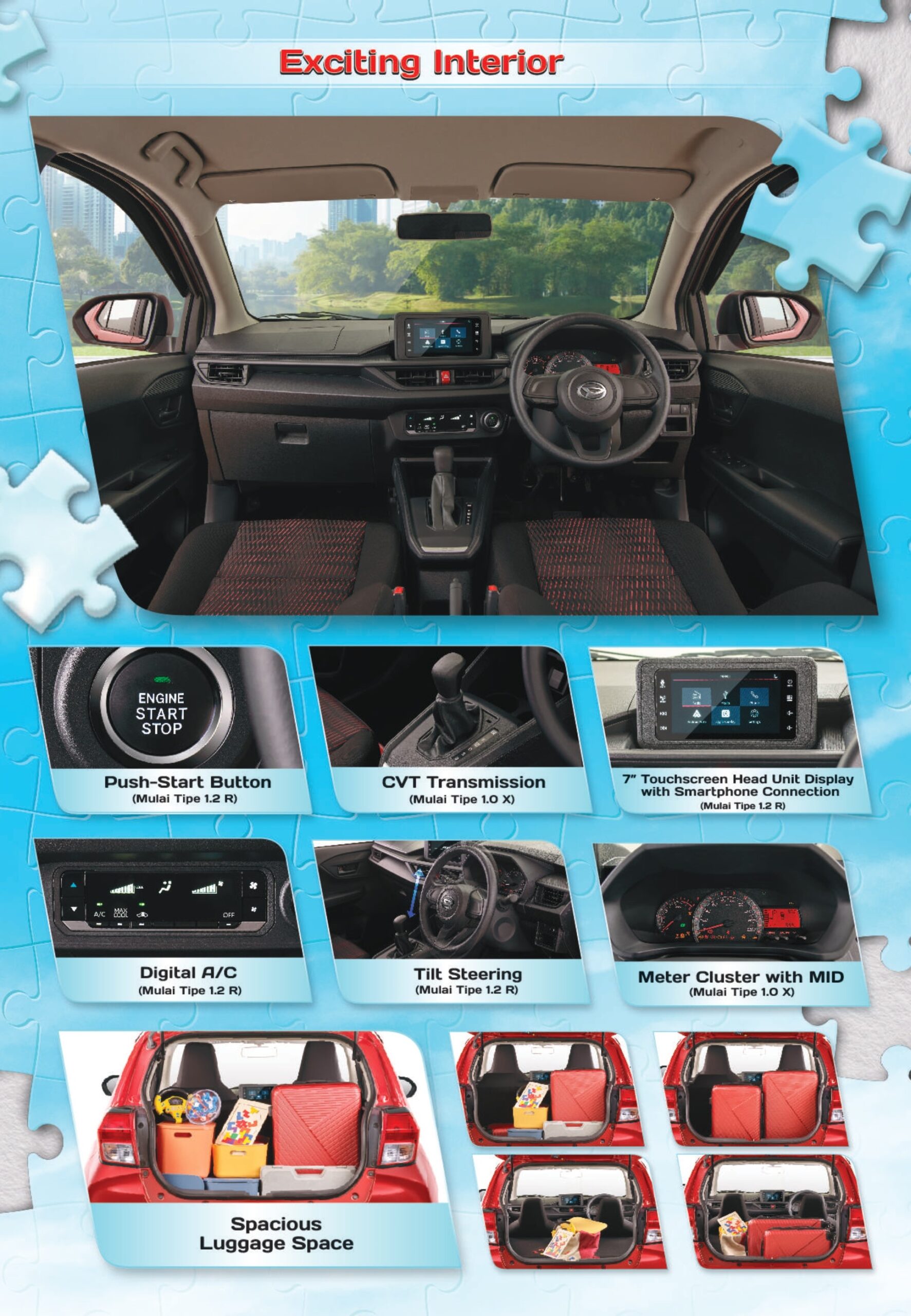 Bagasi yg luas, fitur fitur baru seperti digital AC, head unit display (android auto dan apple car play), tilt steering serta design interior yg stylish membuat pengalaman berkendara anda menjadi lebih nyaman